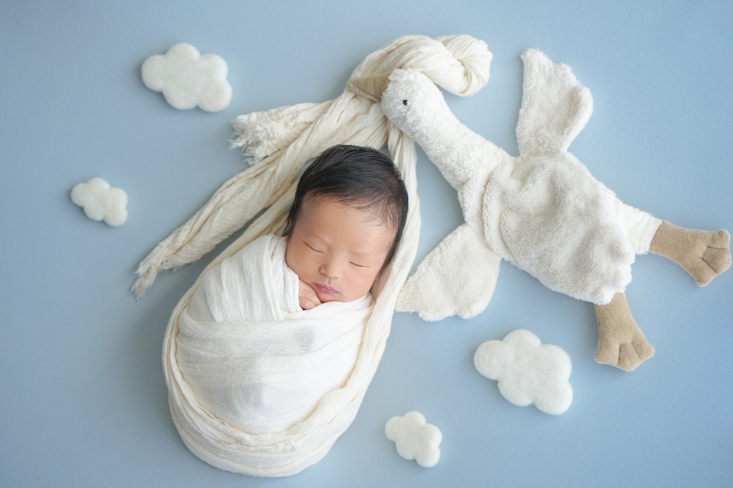ママたちに、最近じわじわと人気が広がっているのが「こうのとり風」のニューボーンフォト。出張撮影というスタイルで、自宅にいながらにしてプロの写真が撮れるというのが、産後のママたちにとっては負担がかからないポイントなんです。特に、まだ外出が難しい新生児期には、自宅でリラックスしながら撮影できるのは本当にオススメです! 撮影前にしっかりとお好みのお色味や雰囲気、スタイリングををお伺いしております。今回は水色や青色こうのとり風でとの事でしたので小物や背景を取り入れることで、まるでおとぎ話のワンシーンのような、優しくて夢のある写真に仕上がりました。 また、出張撮影ならではのメリットとして、赤ちゃんの生活リズムに合わせて撮影できるという点も大きいです。ミルクやおむつ替えのタイミングを見ながら、赤ちゃんがご機嫌な時間帯を狙って撮影することで、より自然で愛らしい表情を引き出すことができます。スタジオ撮影だと時間が限られてしまうこともありますが、自宅なら時間に追われることなく、ママも赤ちゃんもリラックスして臨めるのが魅力です。 さらに、撮影に使う小物や背景布などもすべてこちらで用意してお持ちしますので、ママは特別な準備をする必要はありません。もちろん、思い出のぬいぐるみやおくるみなど、使いたいアイテムがあれば一緒に取り入れることも可能です。そうすることで、よりパーソナルで心に残る一枚に仕上がります。 そして何より、ママの「こういう写真が撮りたい!」という気持ちを大切にしています。産後は体力的にも精神的にも大変な時期ですが、そんな中でも「この瞬間を残したい」という想いに寄り添いながら、安心して撮影を楽しんでもらえるよう心がけています。名古屋市天白区という地域に根ざし、ママたちの声を直接聞きながら、一緒に理想のニューボーンフォトを作り上げていくことが、私の喜びでもあります。 このように、出張撮影ならではの柔軟さと、ママのリクエストに応える丁寧な対応で、天「水色×こうのとり風」ニューボーンフォト。これからも、たくさんのご家族の大切な瞬間を、心を込めてカタチにしていきたいと思います。